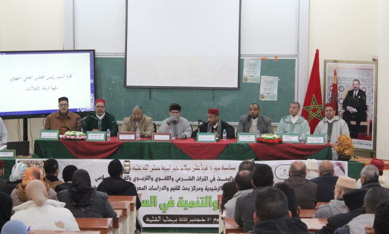 في إطار أنشطته العلمية والإشعاعية، وتنفيذًا لمضامين الرسالة الملكية السامية الموجهة إلى علماء الأمة المغربية بمناسبة مرور خمسة عشر قرنًا على ميلاد خير البرية سيدنا محمد ﷺ، نظم المجلس العلمي المحلي لإقليم الرشيدية، بتنسيق مع الكلية المتعددة التخصصات بالرشيدية، ندوة وطنية علمية في موضوع «سؤال الأخلاق والتنمية في السيرة النبوية»، وذلك يوم الأربعاء 31 دجنبر 2025، برحاب الكلية المتعددة التخصصات بالرشيدية، بحضور جمع غفير من الأساتذة الجامعيين والباحثين وأعضاء المجلس العلمي المحلي، والمرشدين والمرشدات والطلبة، وممثلي بعض الهيئات والمؤسسات.